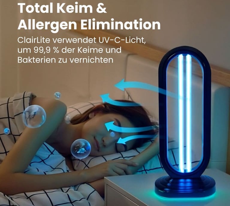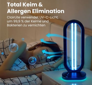 Leistungsstarke Desinfektion des gesamten Raums ohne Aufwand. Mit UV-C-Technologie in Krankenhausqualität und 360°- Abdeckung beseitigt der ClairLite 99,99% aller Keime ohne Chemikalien und ohne Aufwand. Genießen Sie in wenigen Minuten ein saubereres und sichereres Zuhause.
